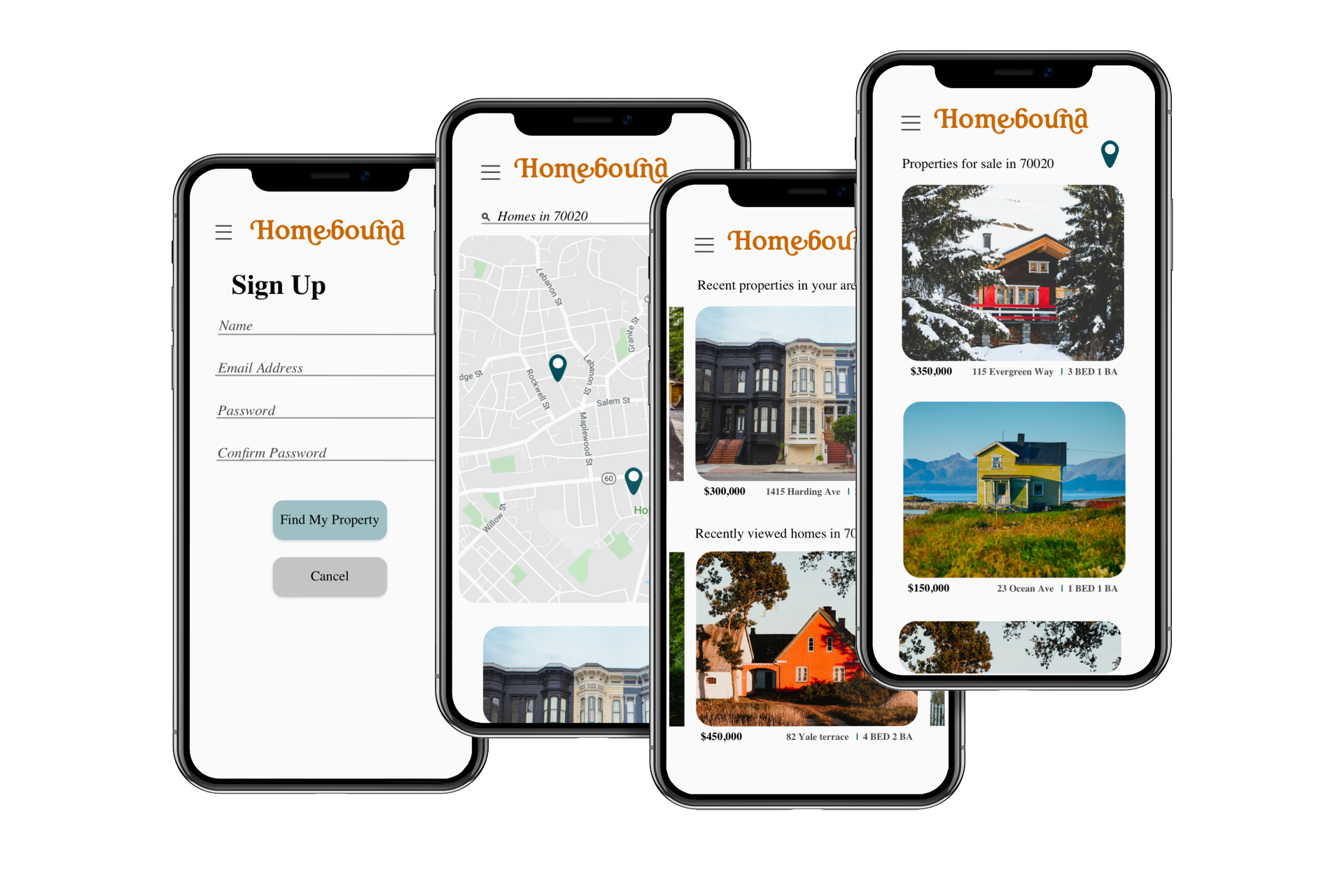 Homebound is an app that connects users to investment properties. What sets my app apart from other apps on the market, is the overall retro app aesthetic, strategic whimsical photography, and its focus on older or historic properties in need of updating or restoring.